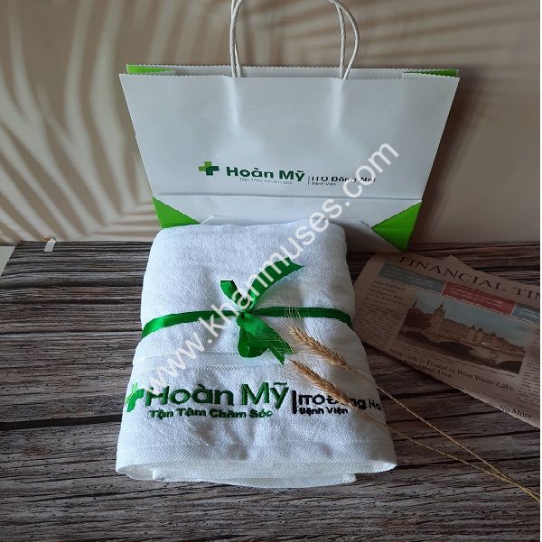 Khăn bông quà tặng cao cấp thêu logo đựng trong túi giấy giấy cao cấp